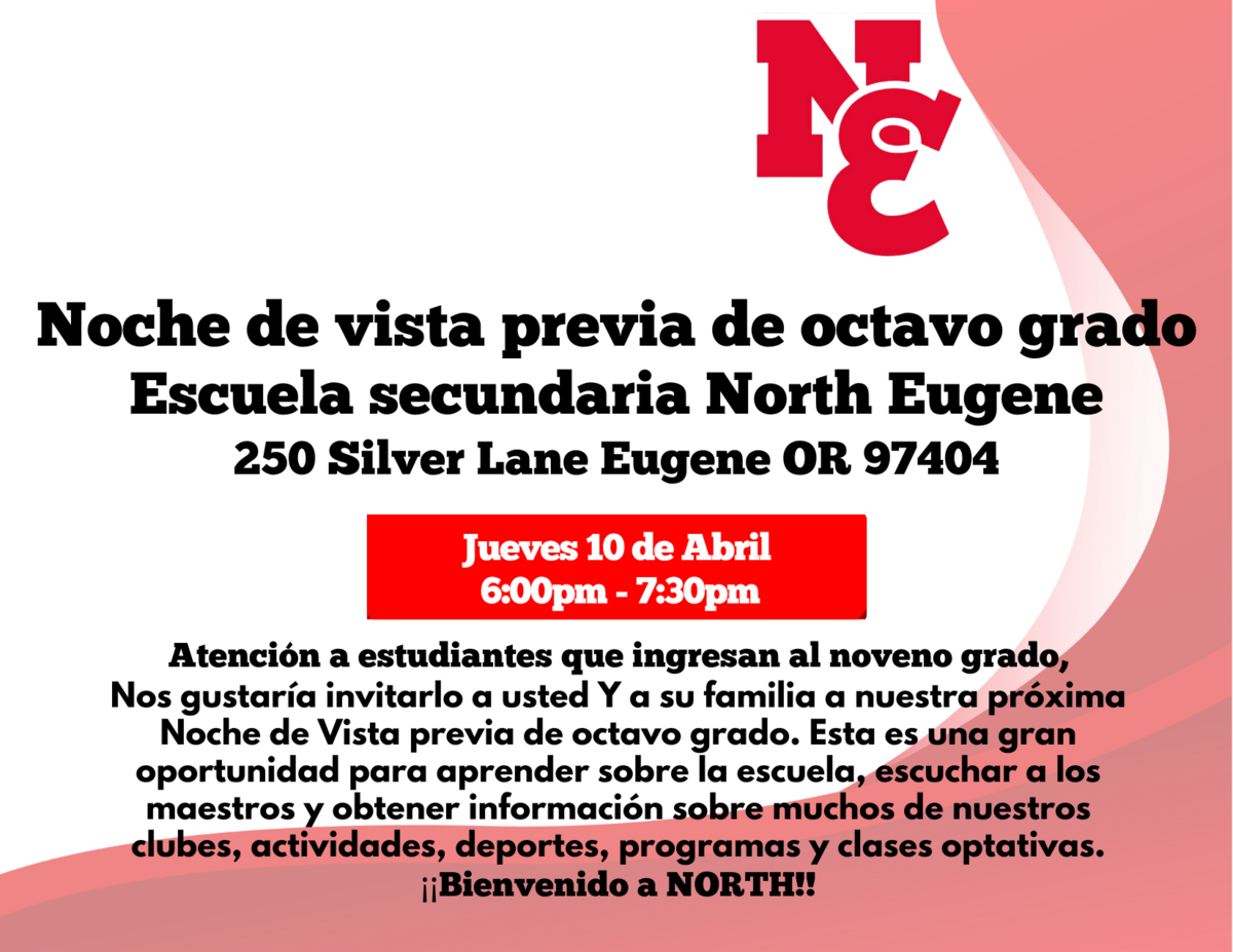 North Eugene High School is hosting it's annual 8th Grade Preview Night on Wednesday, April 10th from 6:00pm -7:30pm! The event will begin in the Main Gym and feature a number of sessions where parents, care givers, and students can learn about athletics, academics, school programs, and more. This is a great chance to meet teachers, staff, see the building, and interact with your peers from other schools. We are looking forward to seeing you and your child there! Please inquire with our main office at (541)790-4500