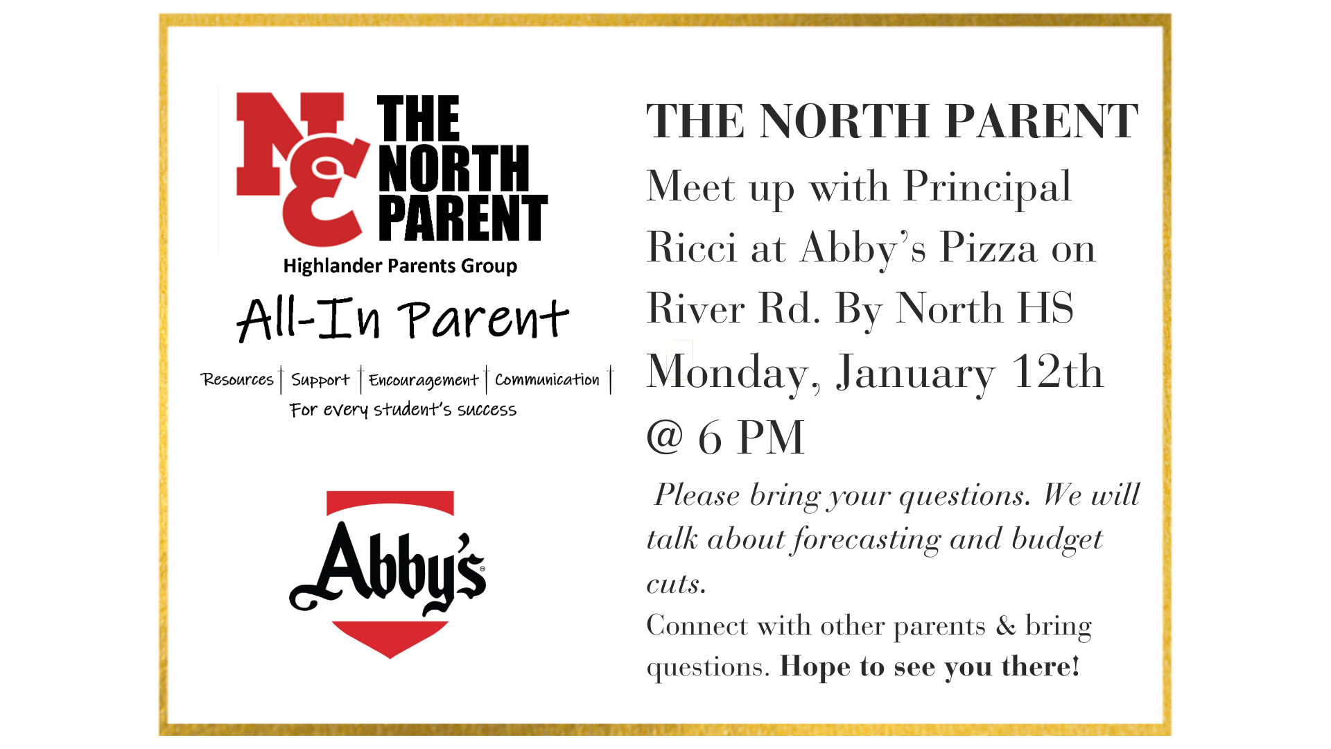 THE NORTH PARENT will have a MEET UP at Abby's Pizza on Jan. 12th @ 6 pm. Principal Ricci will be there to talk about forecasting and the budget. Bring your questions, and we look forward to connecting with you.