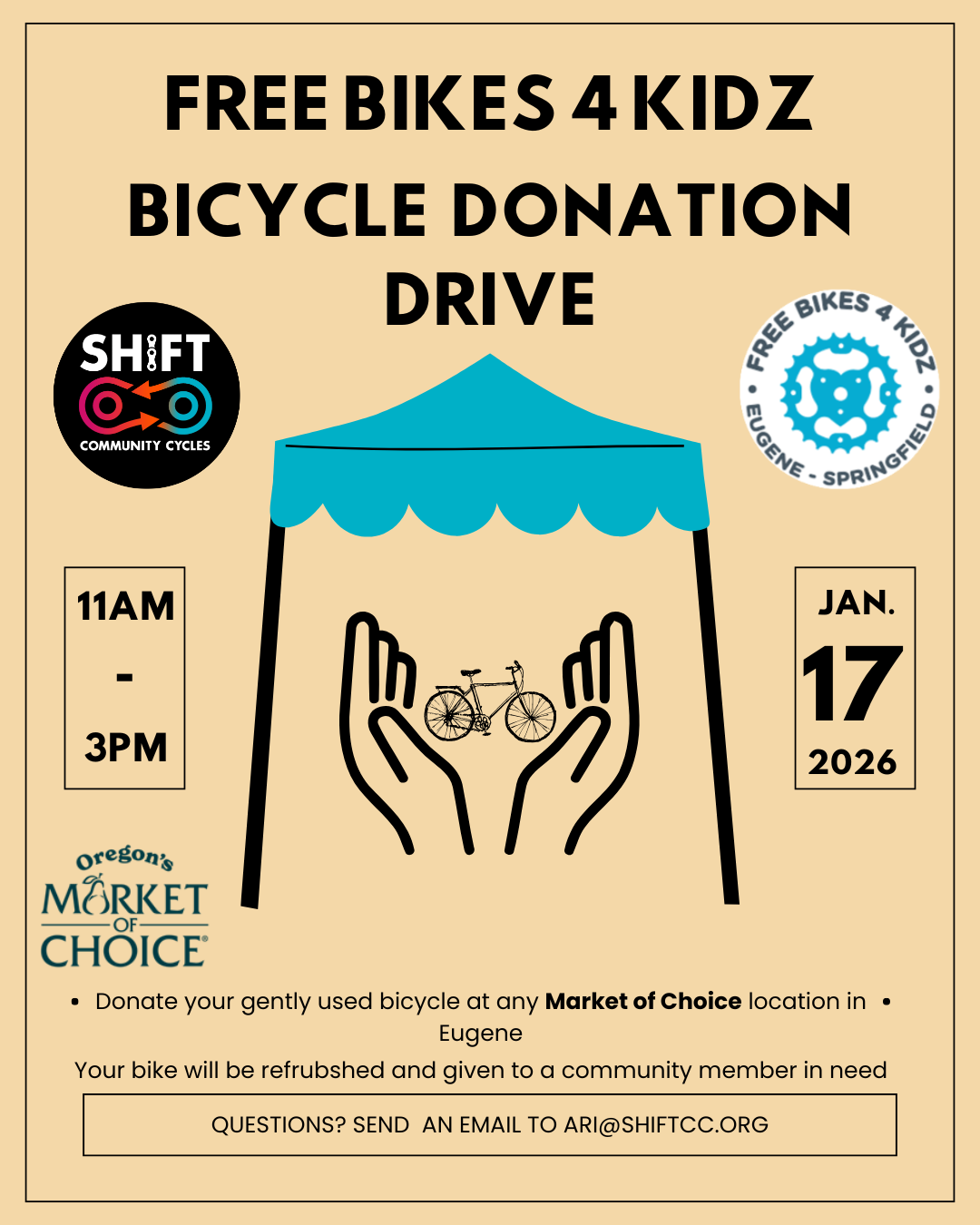 Free Bikes 4 Kidz, in partnership with Shift Community Cycles, is hosting a bicycle donation drive on Saturday, January 17, 2026, from 11:00 a.m. – 3:00 p.m.